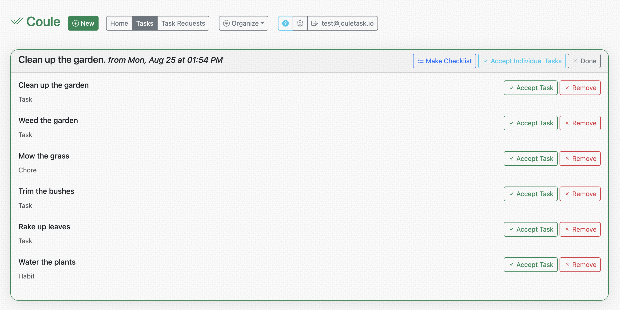 Anyone can send anyone else a Task Request in Coule, and when they do it becomes a trackable object. Think of it as a calendar invite, but for a task, or like a ticket system without all the overhead.