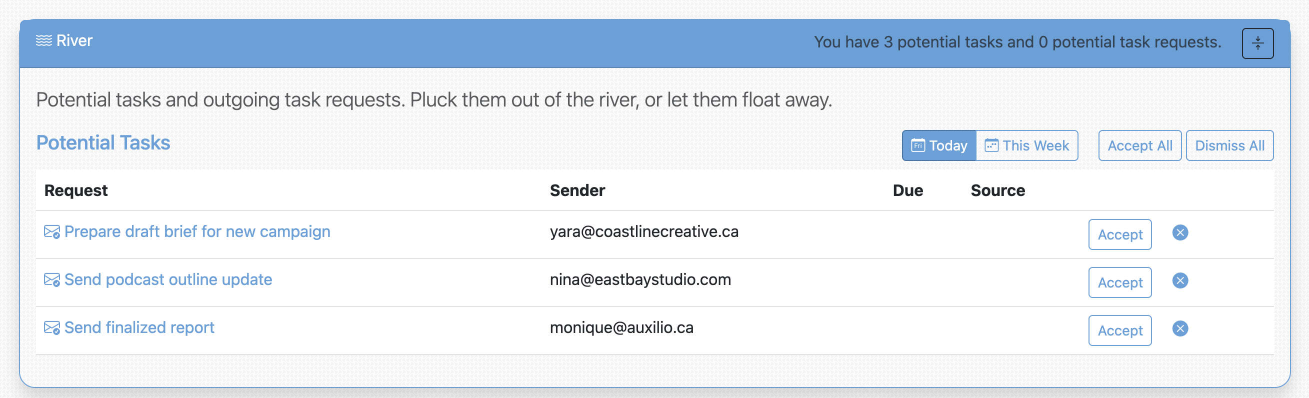 Potential tasks show up in the River. If you accept them they become tasks. If not, they'll float away and eventually disappear. It's up to you.